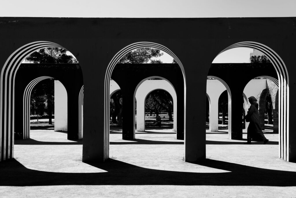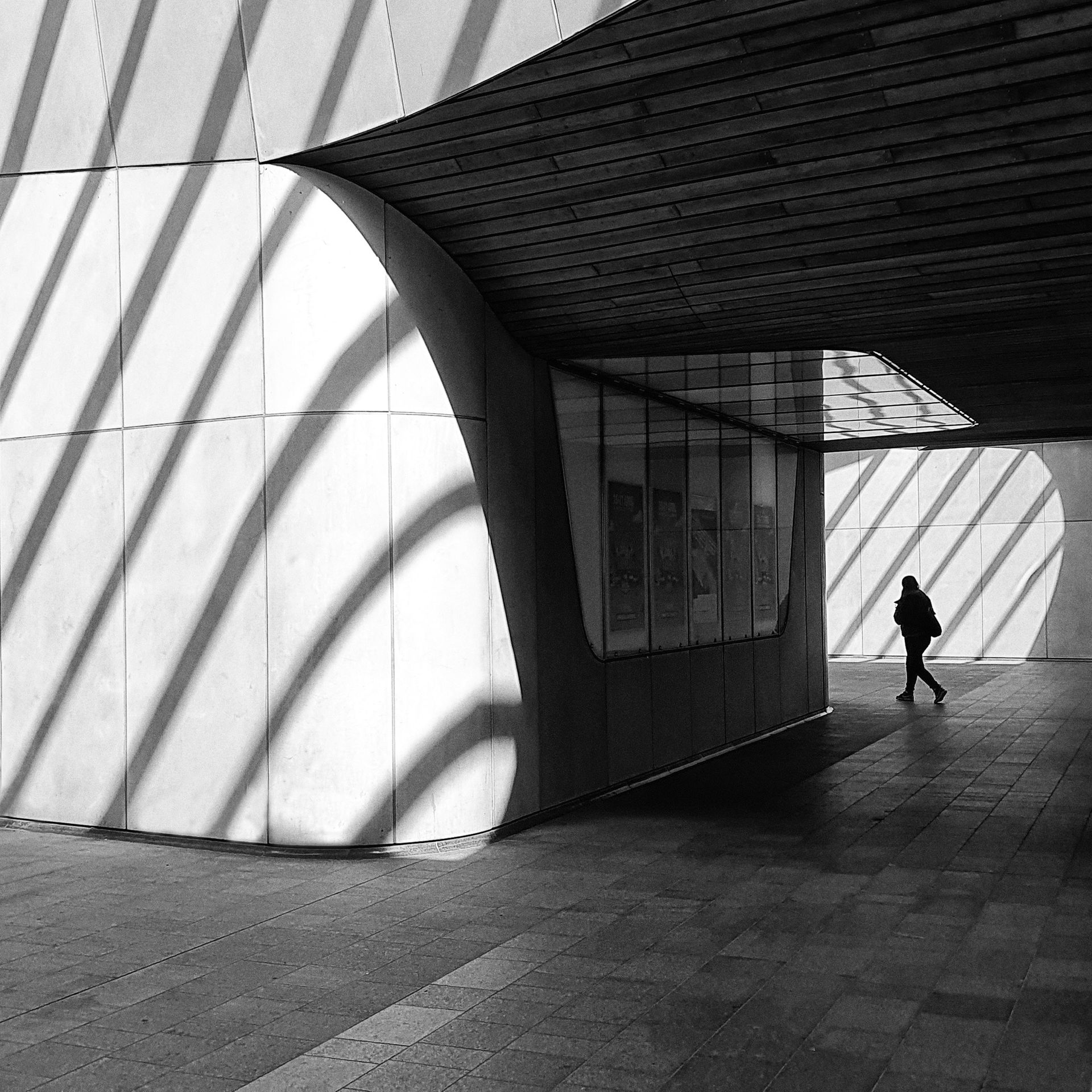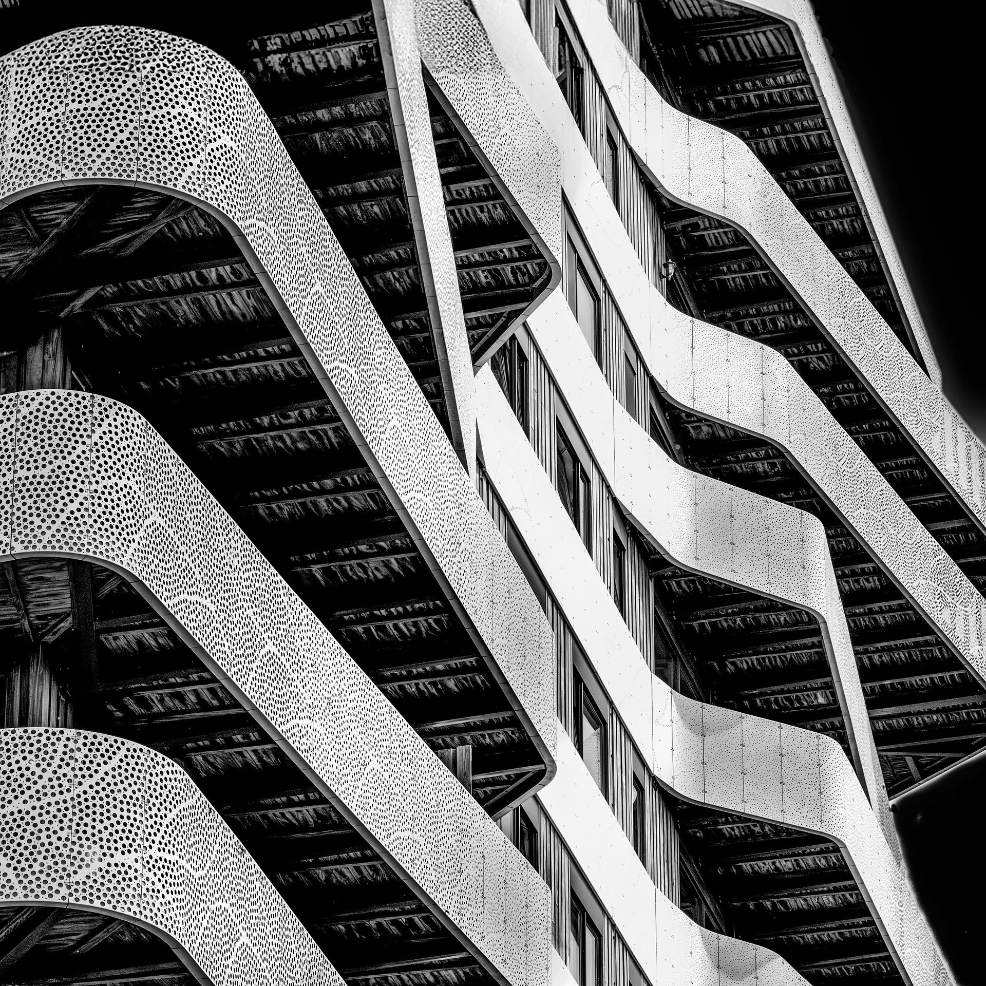 De foto van Martin van Timmeren heeft architectuur als onderwerp. Het gebouw is gereduceerd tot een verzameling lijnen, schaduwen, structuren en richtingen; hoe het gebouw er eigenlijk uitziet, is op de achtergrond geraakt door het abstraherende effect van de toepassing van alleen zwart-wit. Martin heeft heel goed begrepen hoe je het oorspronkelijke werk van de architect kunt gebruiken om dat met behulp van zwart-witfotografie naar je eigen hand te zetten.