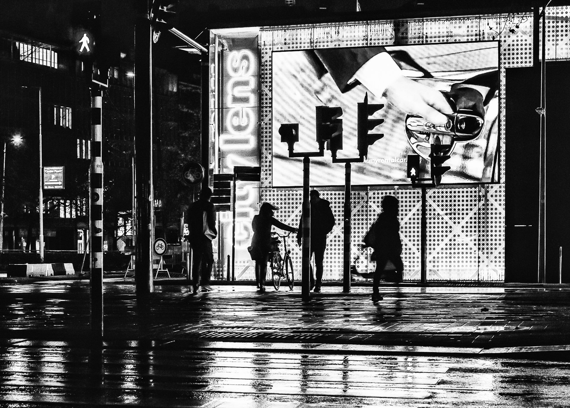 Vandaag de dag is zwart-wit ook het domein van fotografen met kunstzinnige ambities. Ik bespreek er enkele. Eerst de foto van Dick van Vuurde. Zijn foto is een kruising van een straatfoto, een documentaire foto en een foto met kunstzinnige aspiraties. Maar bovenal is het een prachtige foto. Er is enorm veel te zien, en dat alles is ondergebracht in een perfecte compositie, alle lijnen zijn recht overeind gezet, zodat de foto minder druk wordt. Wat een prachtige zwart-wit verdeling, lekker contrastrijk en daardoor grafisch qua looks. Een filmisch beeld van deze stad, met veel info over hoe het er daar uitziet en hoe je je zou voelen als je er aanwezig bent. En die nattigheid op straat helpt ook een handje.