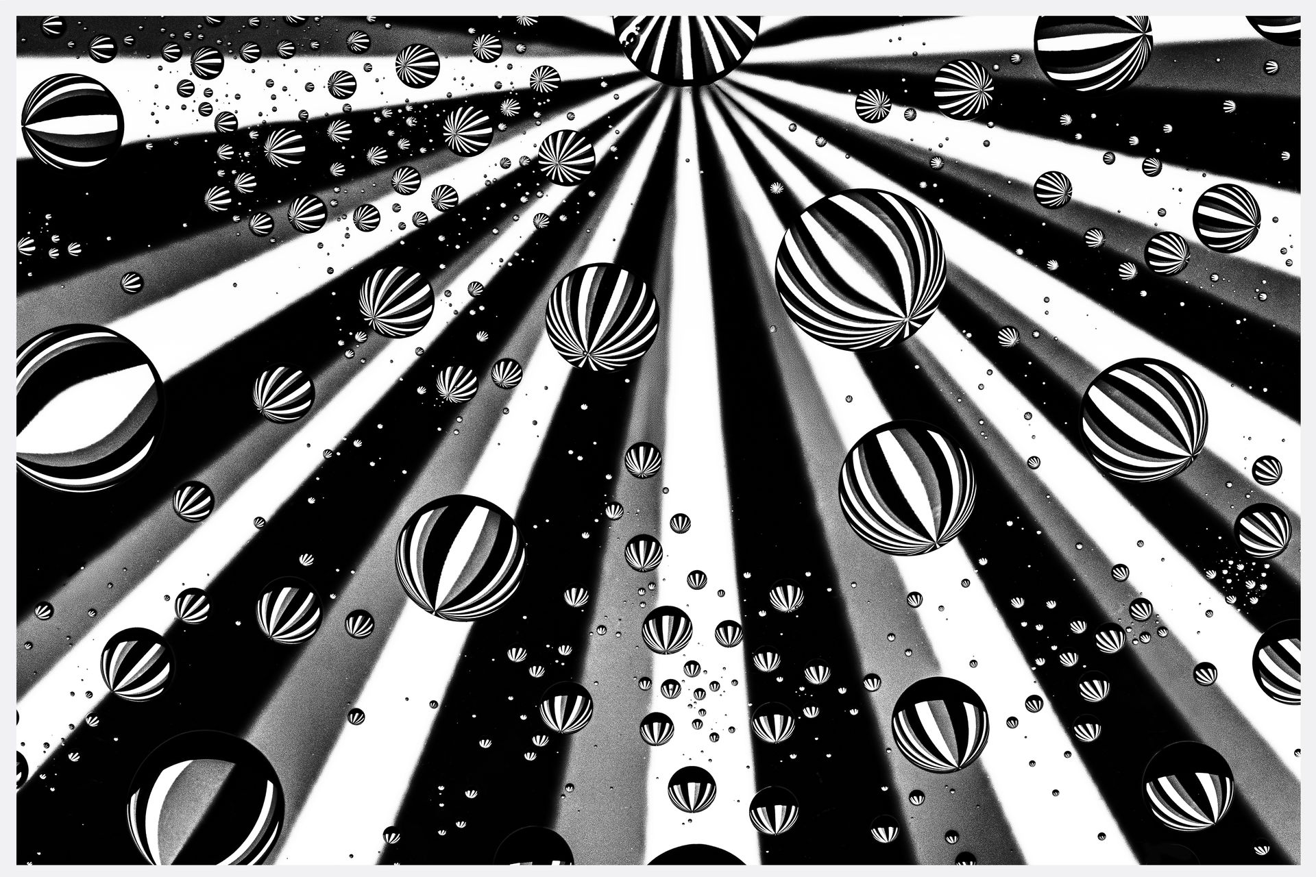 Jeanny Witlox maakte haar eigen beeld. Het is alsof er een invasie van luchtballonnen op ons afkomt; de ballonnen worden steeds groter en dat werkt heel suggestief. Het beeld is heel decoratief, door de structuren en de richting in het beeld. En natuurlijk door de grafische vormgeving. Jeanny heeft met een nevelspuit druppeltjes gemaakt op een glazen plaat en op een tablet beelden gemaakt en die onder de glasplaat gehouden. Van die aanpak is niets zichtbaar en dat zorgt ervoor dat de foto helemaal voor zichzelf spreekt. Een creatieve prestatie.